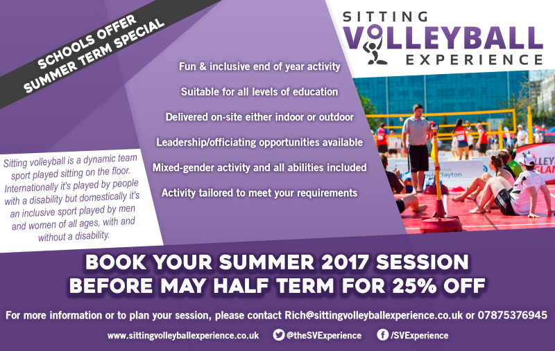Sitting volleyball sessions are ideal in that everyone can play. The sport is mixed-gender and mixed-ability so all students can play together.